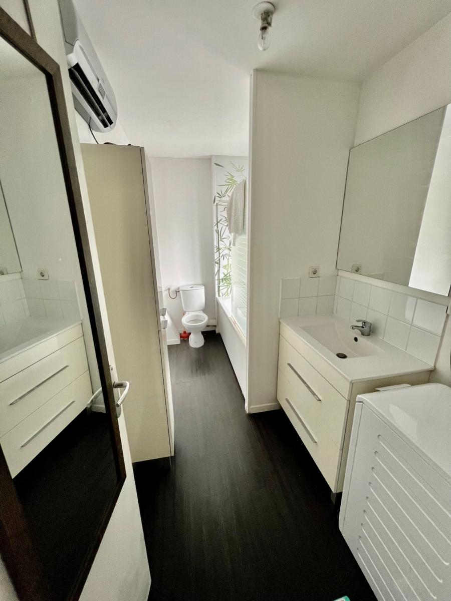 Beau T2 en duplex au deuxième étage d'un petit immeuble, comprenant une belle pièce de vie avec un coin cuisine aménagé et équipé, une salle de bains avec une machine à laver et WC. A l'étage, une chambre avec placards.