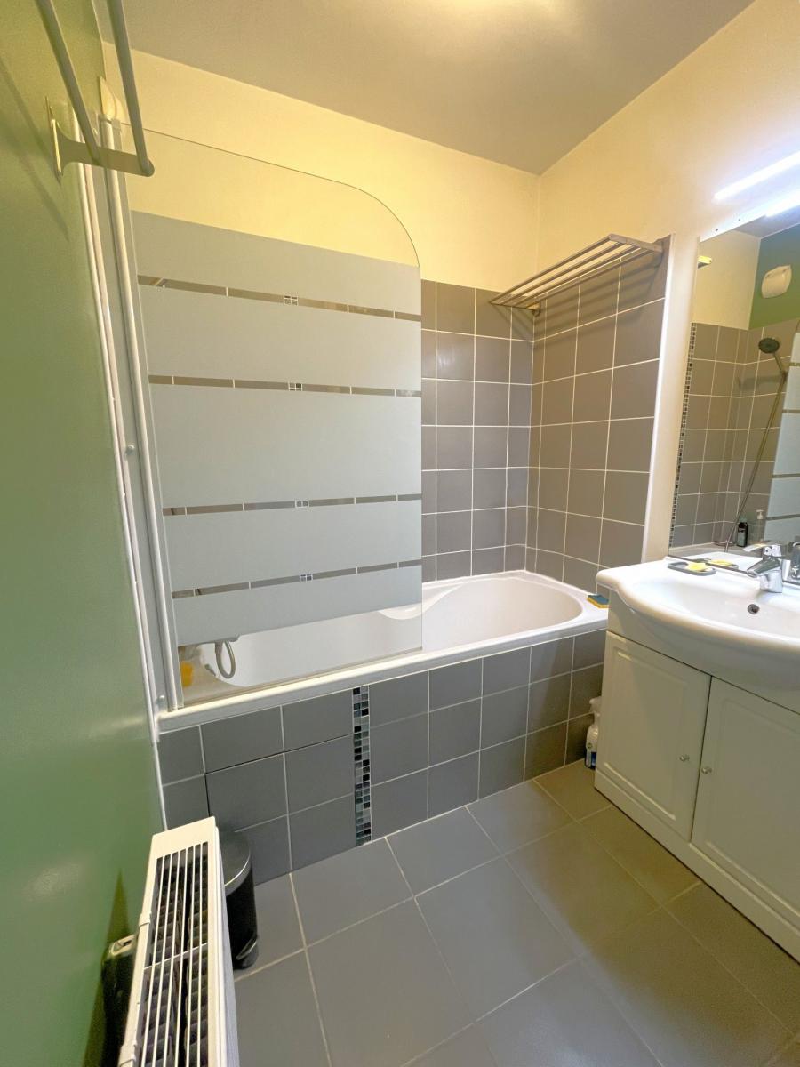 La salle de bains carrelée est équipée d’une baignoire et d’un meuble vasque. Les toilettes sont indépendantes.