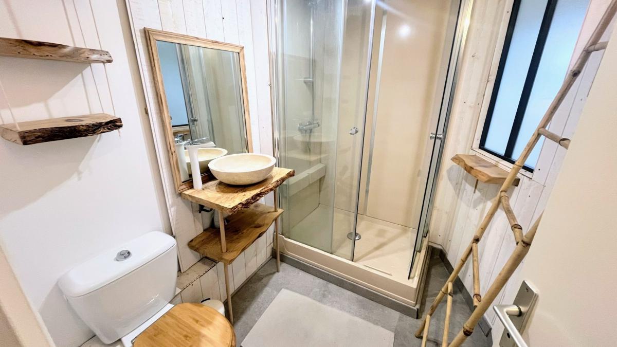 - Une salle de douche avec grande douche, lavabo et toilette,
