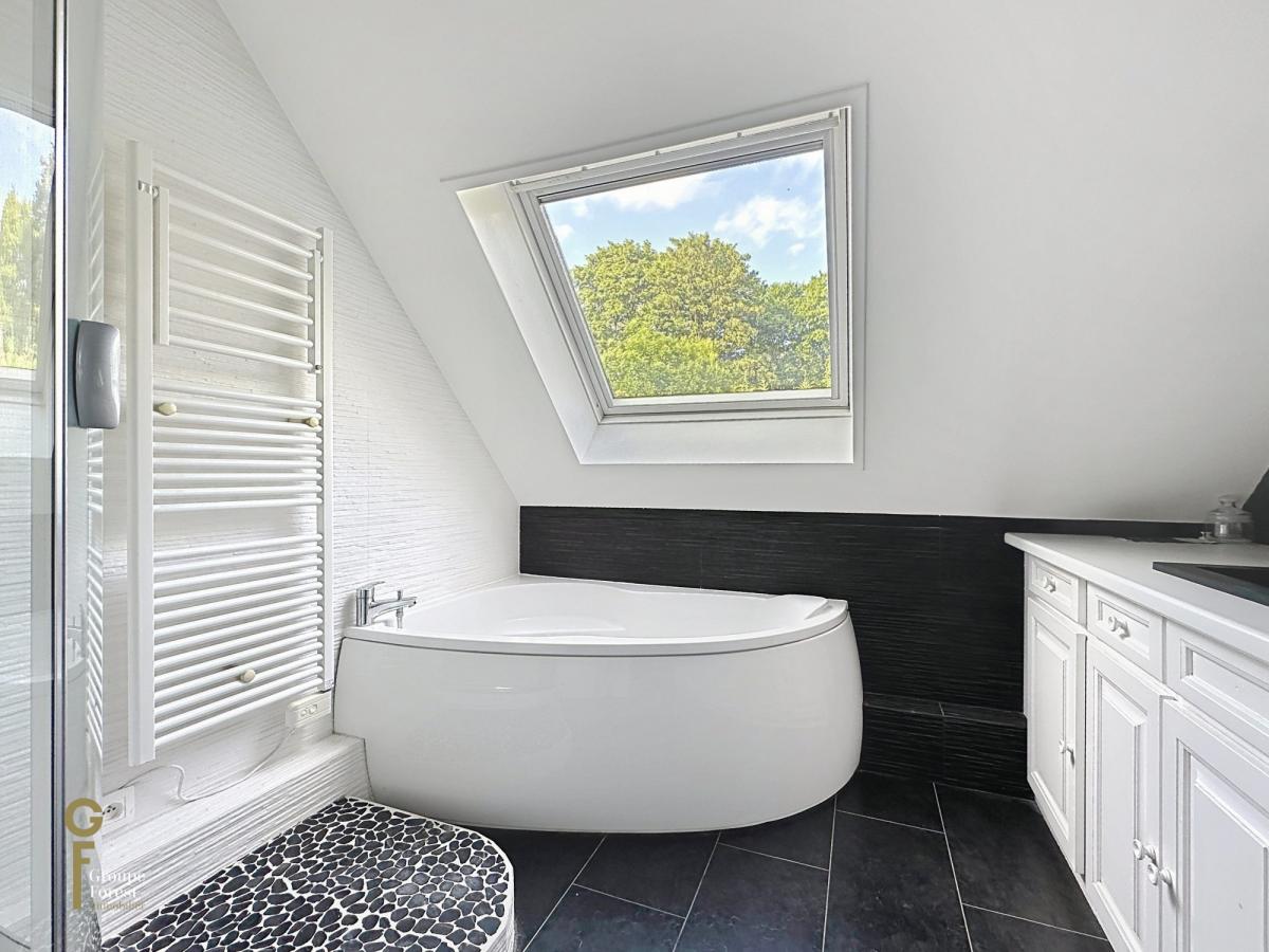 Le premier étage dessert quatre chambres dont deux pourvues de placards et une salle de bains complète avec baignoire, douche et deux vasques.