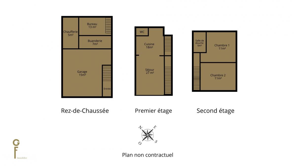 Le second étage dessert deux chambres de 11 m² dont une pourvue de placards et une salle de douche avec un WC.