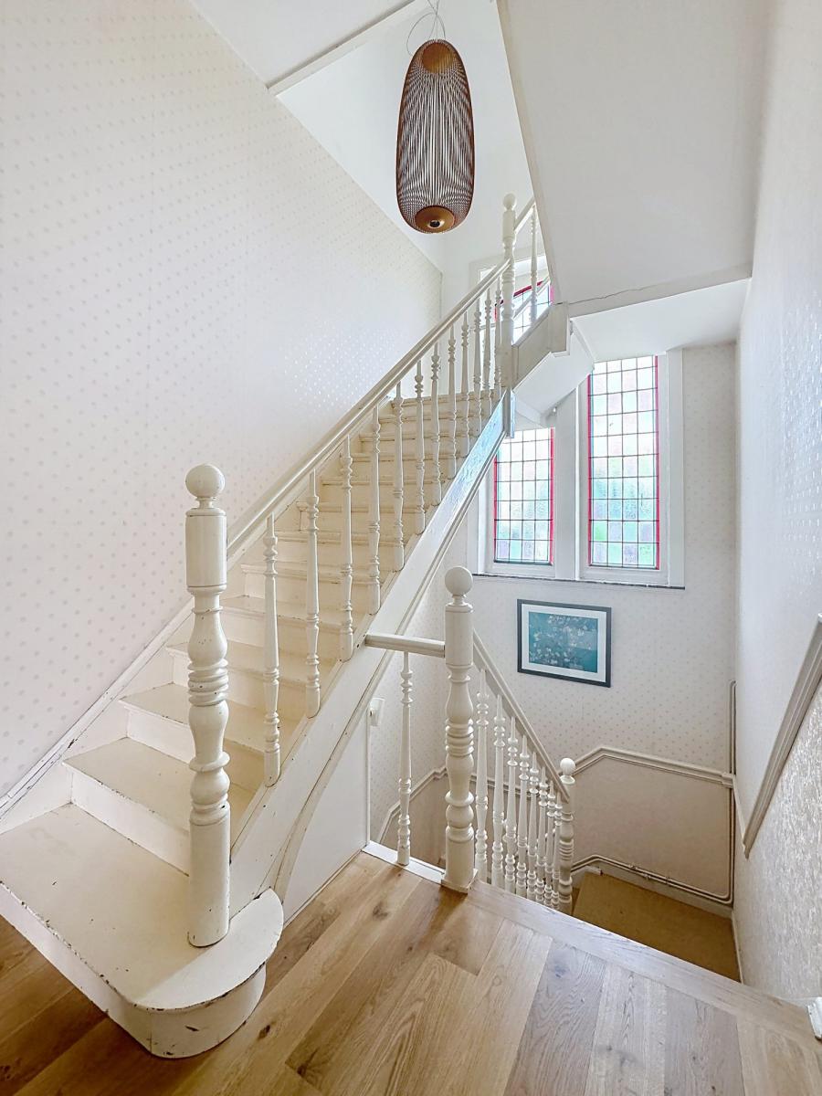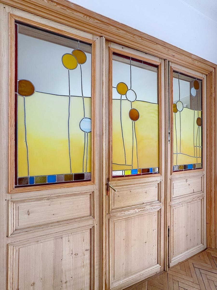 Le rez-de-chaussée distribue une entrée de caractère, une triple réception de 80 m² avec parquet, moulures, vitraux, insert, hauteur sous plafond de 4 mètres, une cuisine de 23 m² entièrement équipée avec son espace repas et des WC.