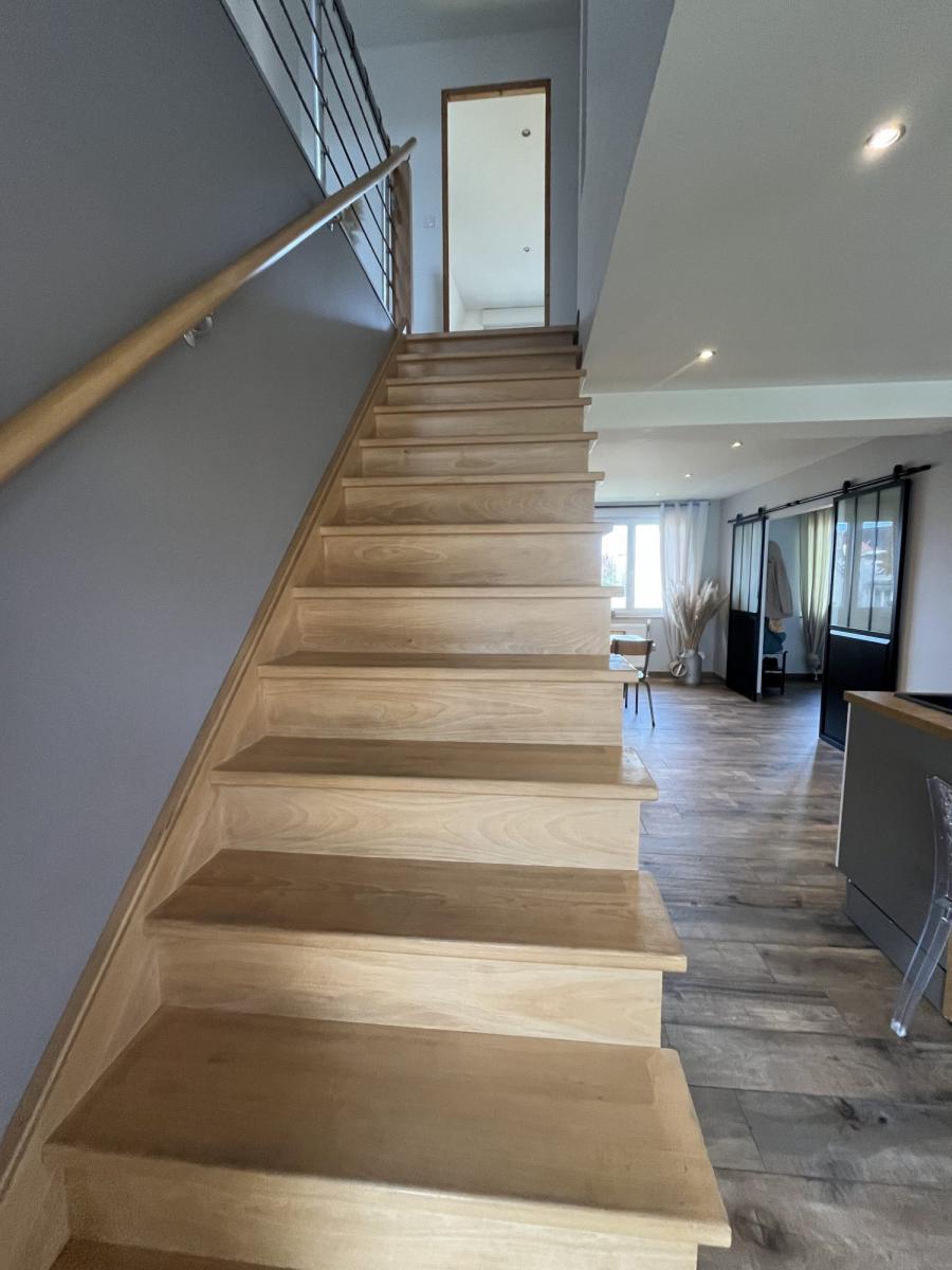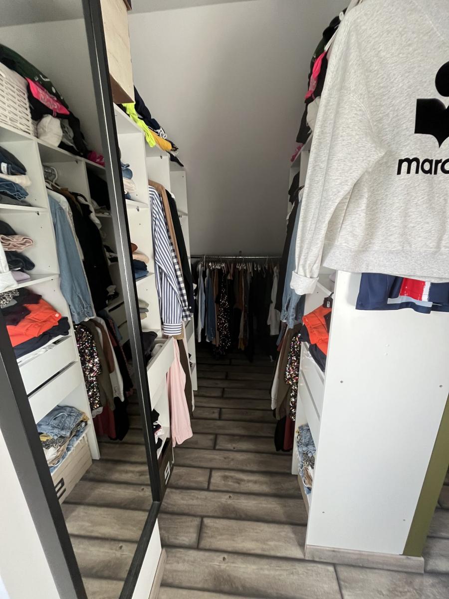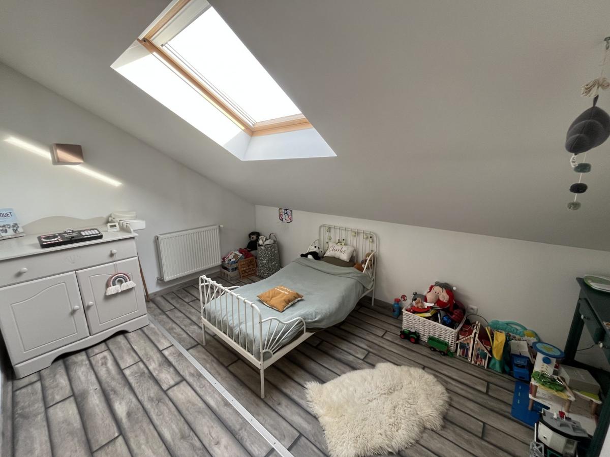 A l'étage, l'espace nuit est composé de 2 belles chambres, une suite parentale avec dressing et salle de douche, une petite chambre de bébé et un WC individuel.