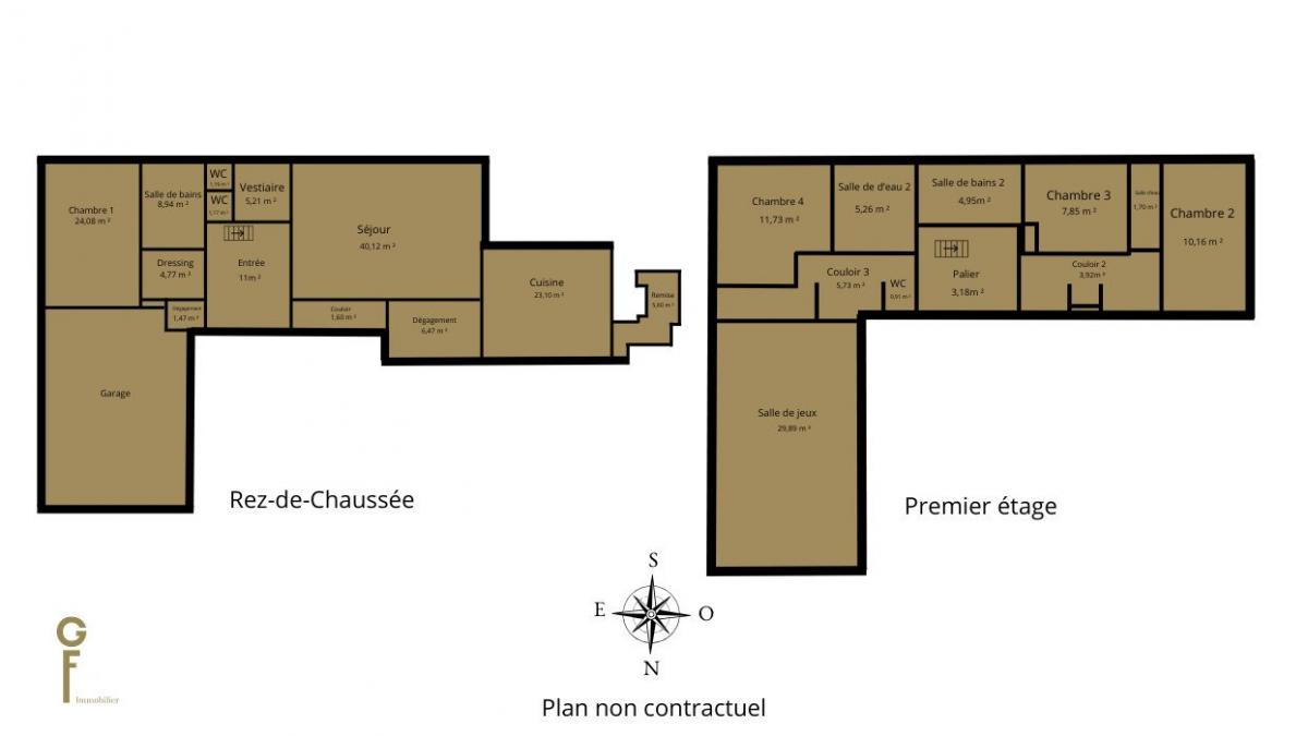 L'étage et son large palier desservent quatres chambres, une salle de bains, une salle d'eau, une immense salle de jeux de 30 m² et un grenier aménageable.