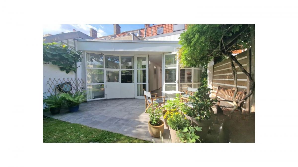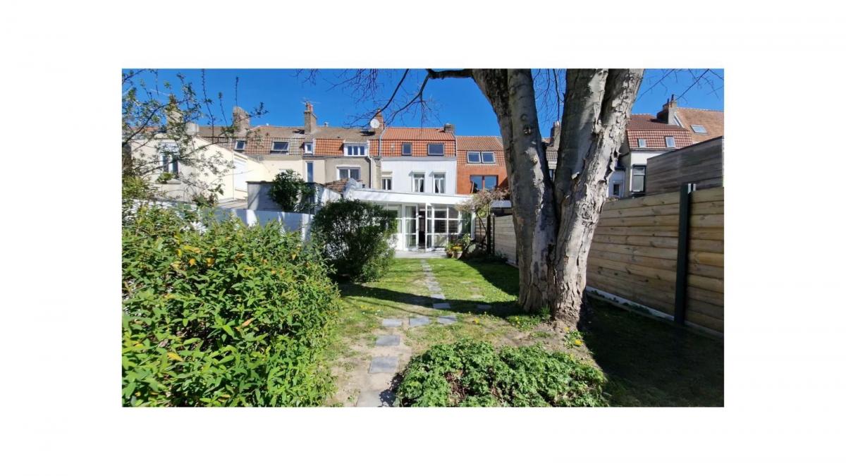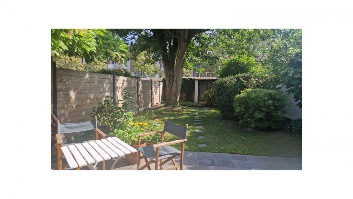 Le jardin d'environ 100m² est parfaitement arboré et exposé, il possède un coin terrasse neuf et donne un accès direct au garage de 30m² (ouverture motorisée, place pour 2 voitures ).
