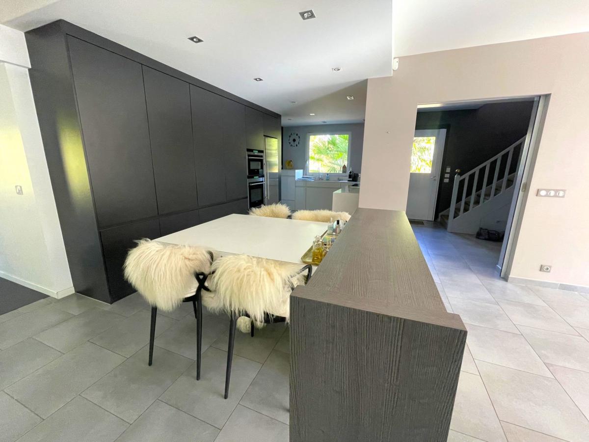 Au rez-de-chaussée, une vaste réception d’environ 80 m², composée d’un salon et d’une salle à manger, s’ouvre sur le jardin grâce à de larges baies vitrées, assurant une parfaite continuité entre intérieur et extérieur. Une cuisine ouverte, contemporaine et entièrement équipée, complète cet espace de vie raffiné.