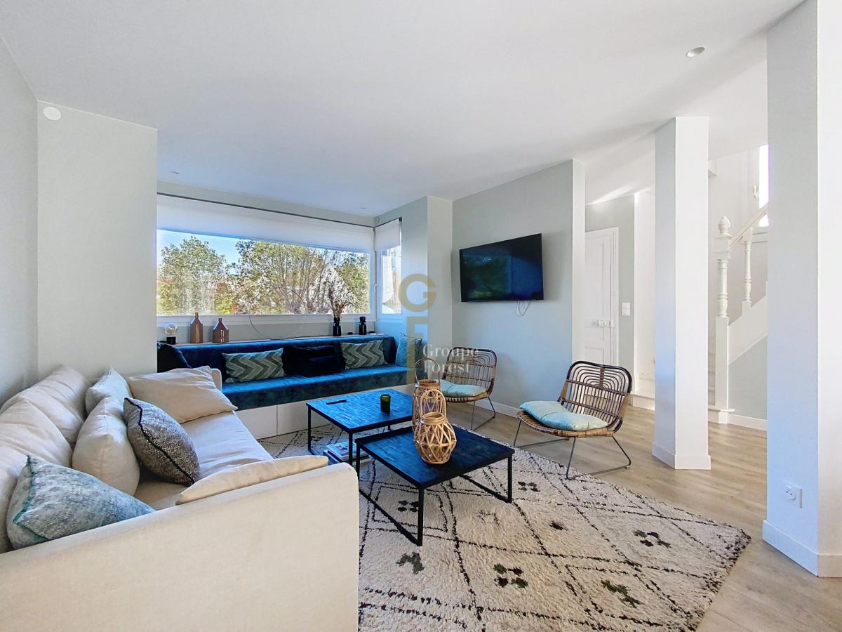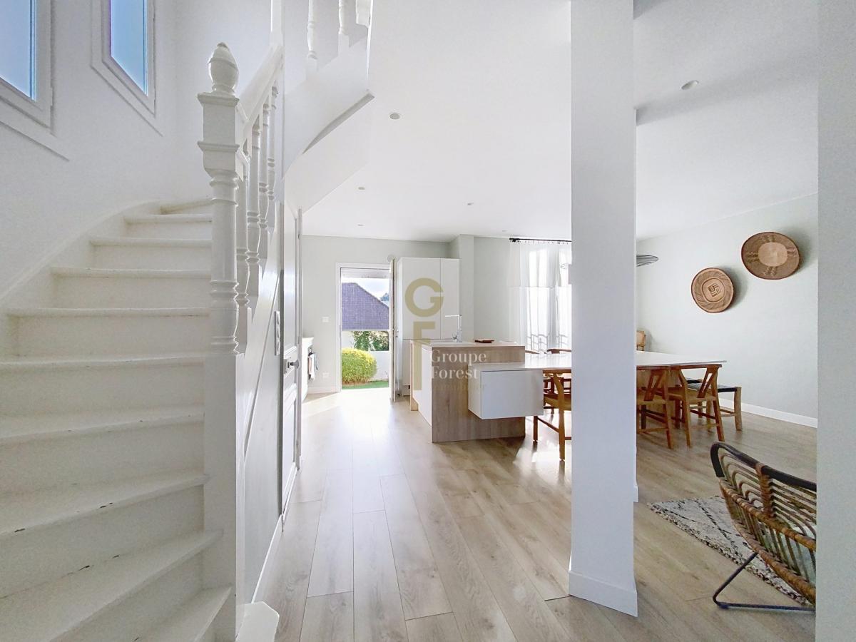 Un escalier permet l'accès au hall d'entrée qui distribue une belle pièce de vie très lumineuse, avec un salon séjour, une salle à manger et une cuisine entièrement équipée ouverte, avec un accès extérieur donnant sur la terrasse bois et le jardin exposition Sud Est.