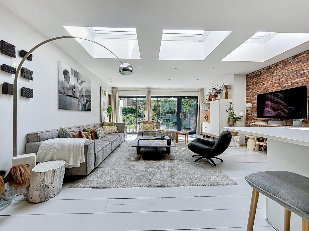 Grande pièce de vie de 63 m², baignée de lumière, avec un poêle à granulés