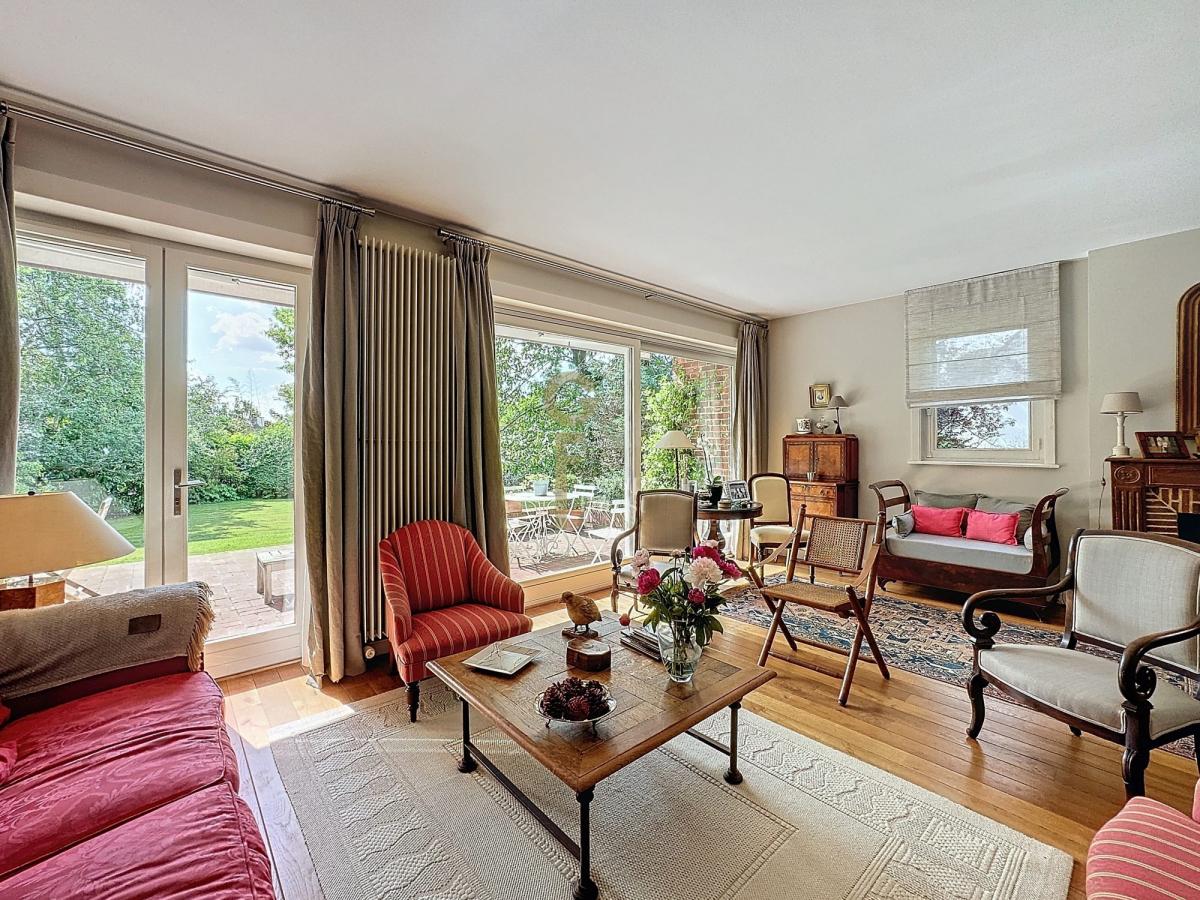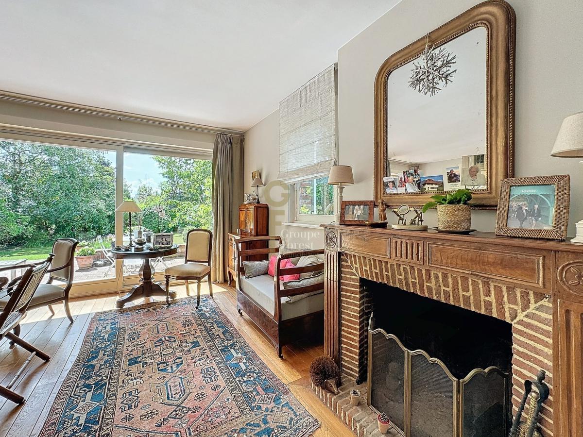 Séjour parqueté chêne avec jolie cheminée donnant sur beau jardin arboré sud est.