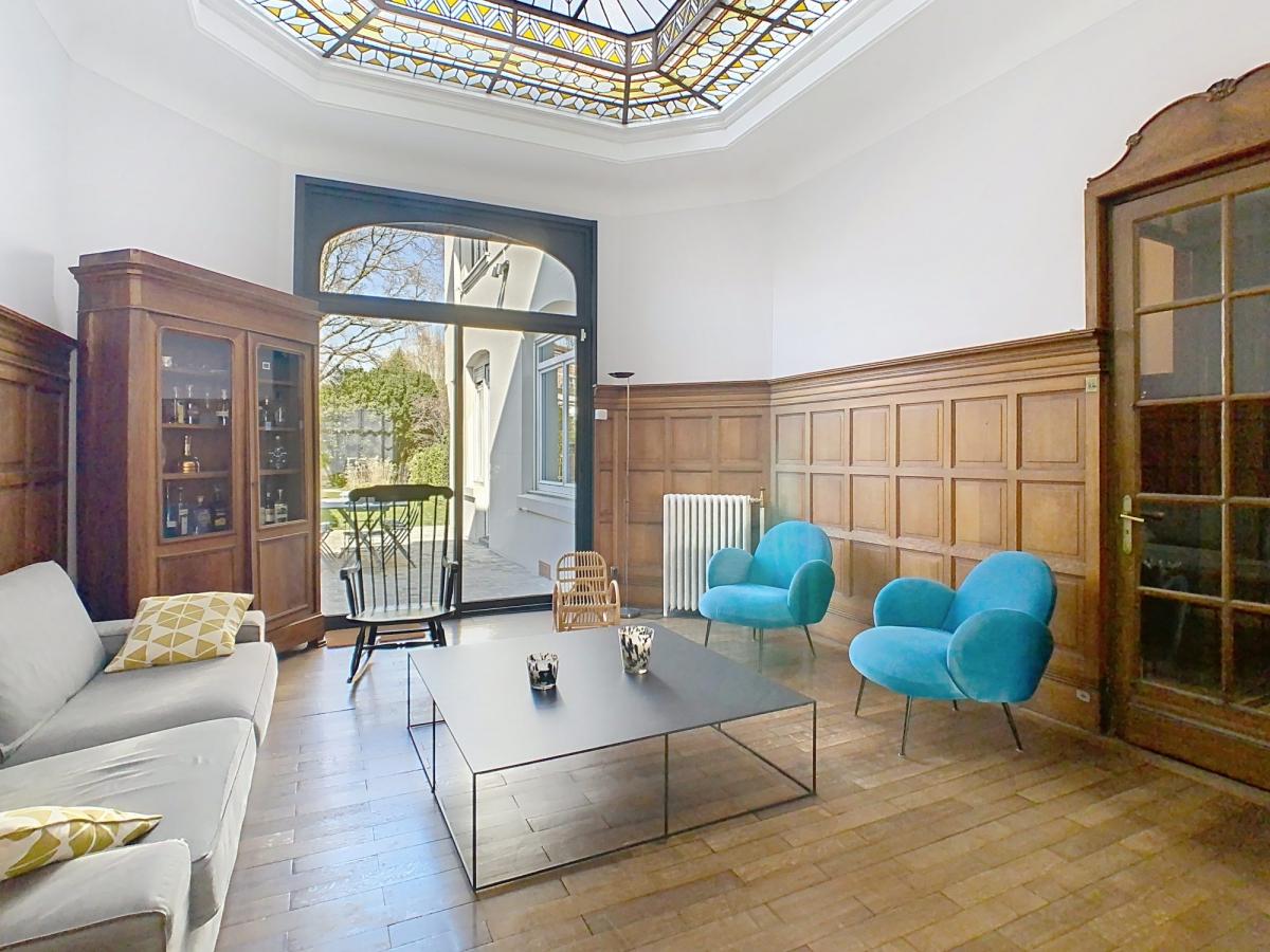 Les boiseries, vitraux et moulures mettent en lumière cette magnifique pièce de vie typique des années 20.