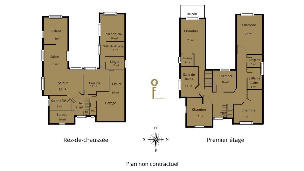Le rez-de-chaussée distribue une large entrée de 10 m² avec vide cathédrale, un séjour de 51 m² parqueté avec une cheminée feu de bois, une salle billard de 18 m², une cuisine dînatoire de 19 m², un cellier de 9 m², une buanderie, une salle télé de 9 m², un bureau de 9 m², une salle détente ou chambre de 20 m² agrémenté d'un poêle et une salle de douche de 11 m².