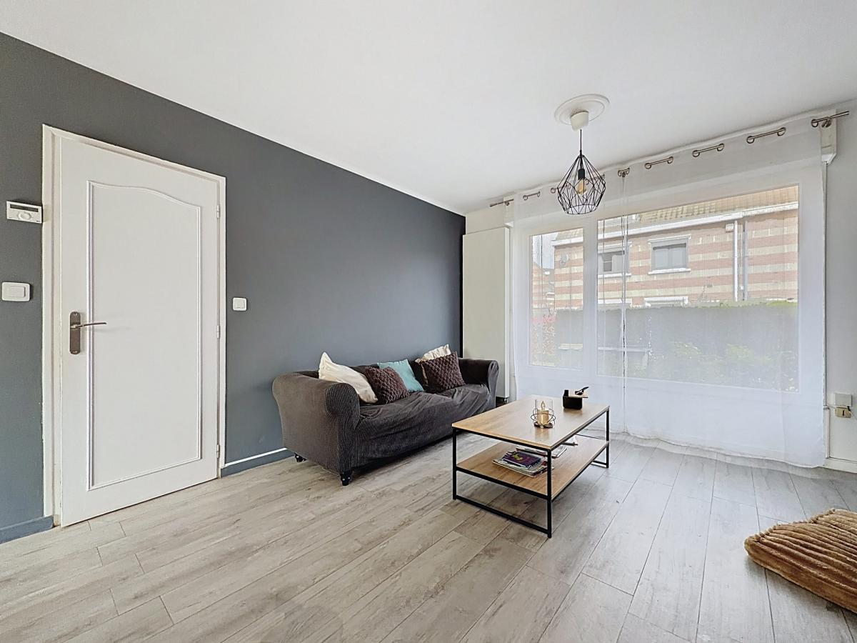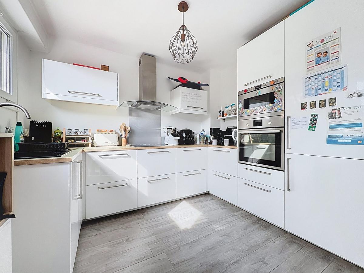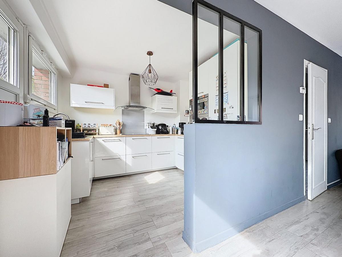 Belle entrée, wc et accès cave, séjour traversant très lumineux de 27 m², cuisine équipée semi-ouverte.