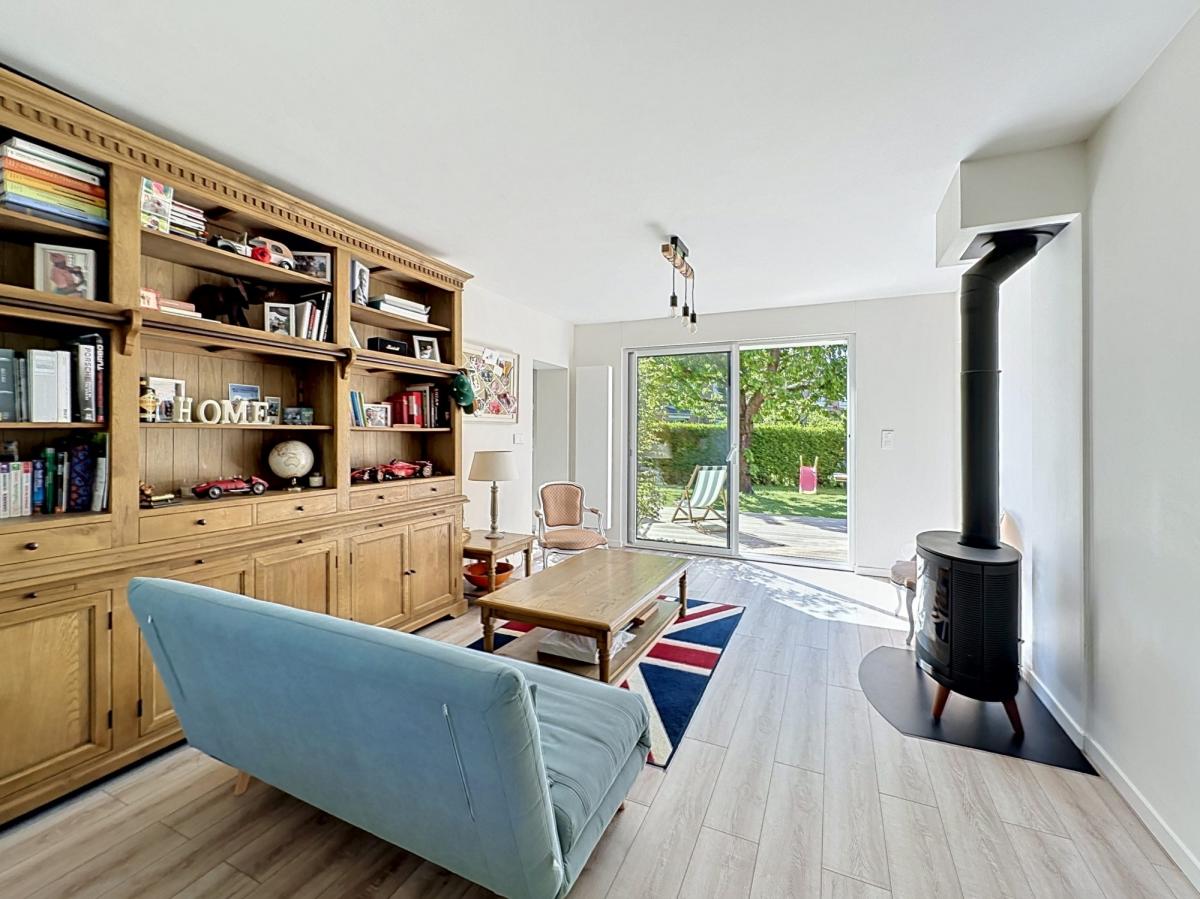 D'un beau salon traversant de 26m2 (possibilité de l'agrandir sur le bureau) donnant sur un beau jardin arboré exposé plein Sud.