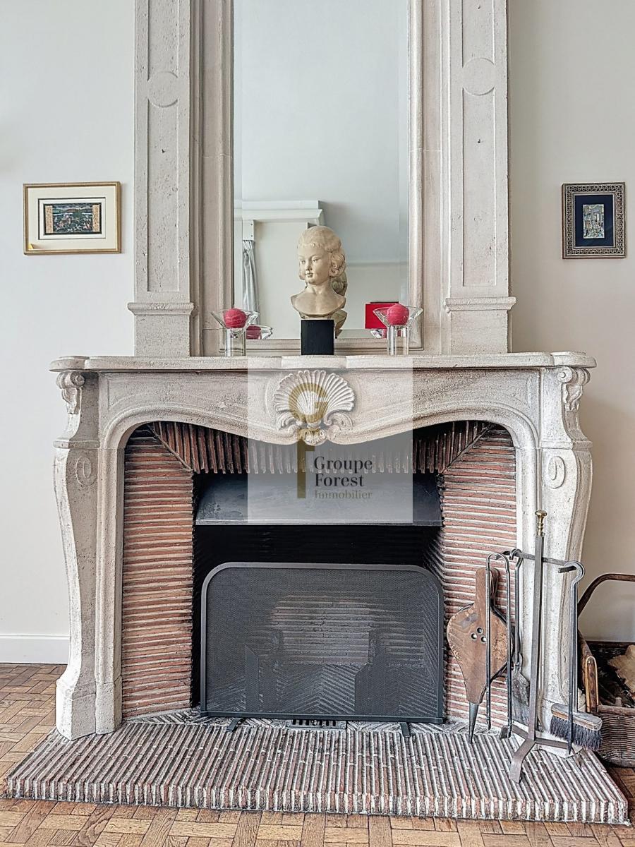 Le rez-de-chaussée distribue une entrée de caractère avec un bel escalier en fer forgé, un salon-salle à manger traversant de 45 m² agrémenté d'une cheminée feu de bois, un espace repas, une cuisine séparée entièrement équipée, un bureau, un vestiaire et un WC.