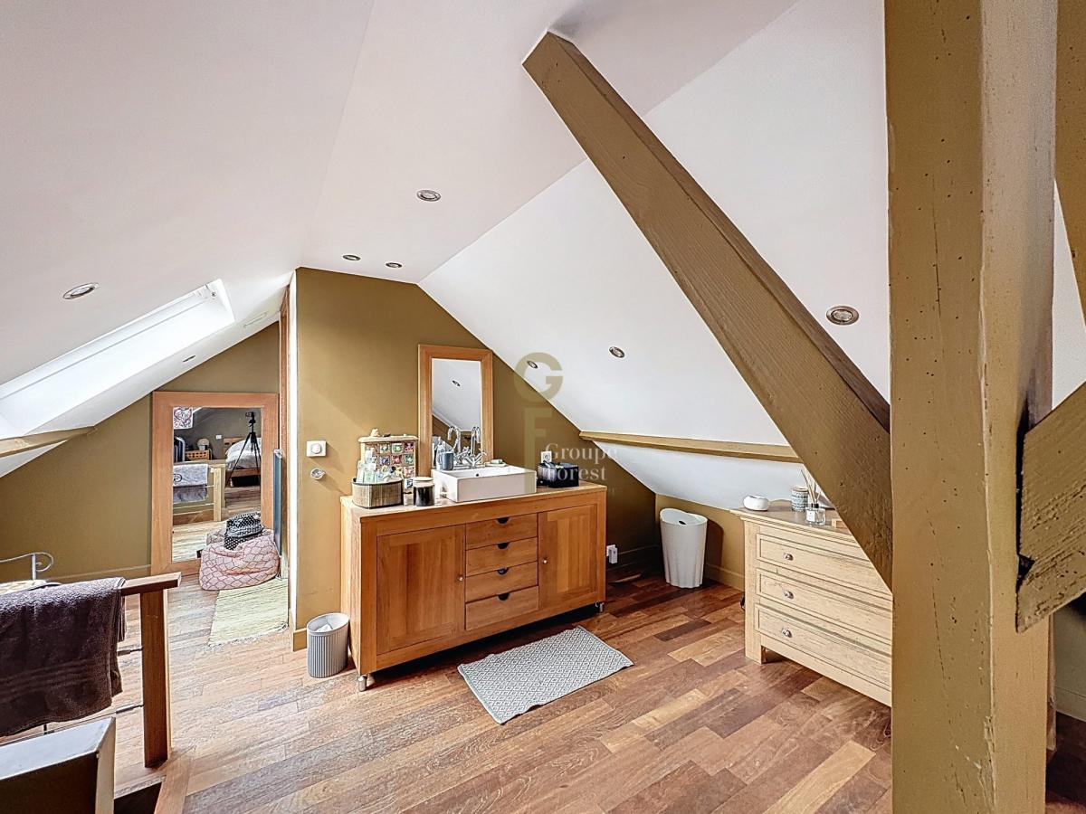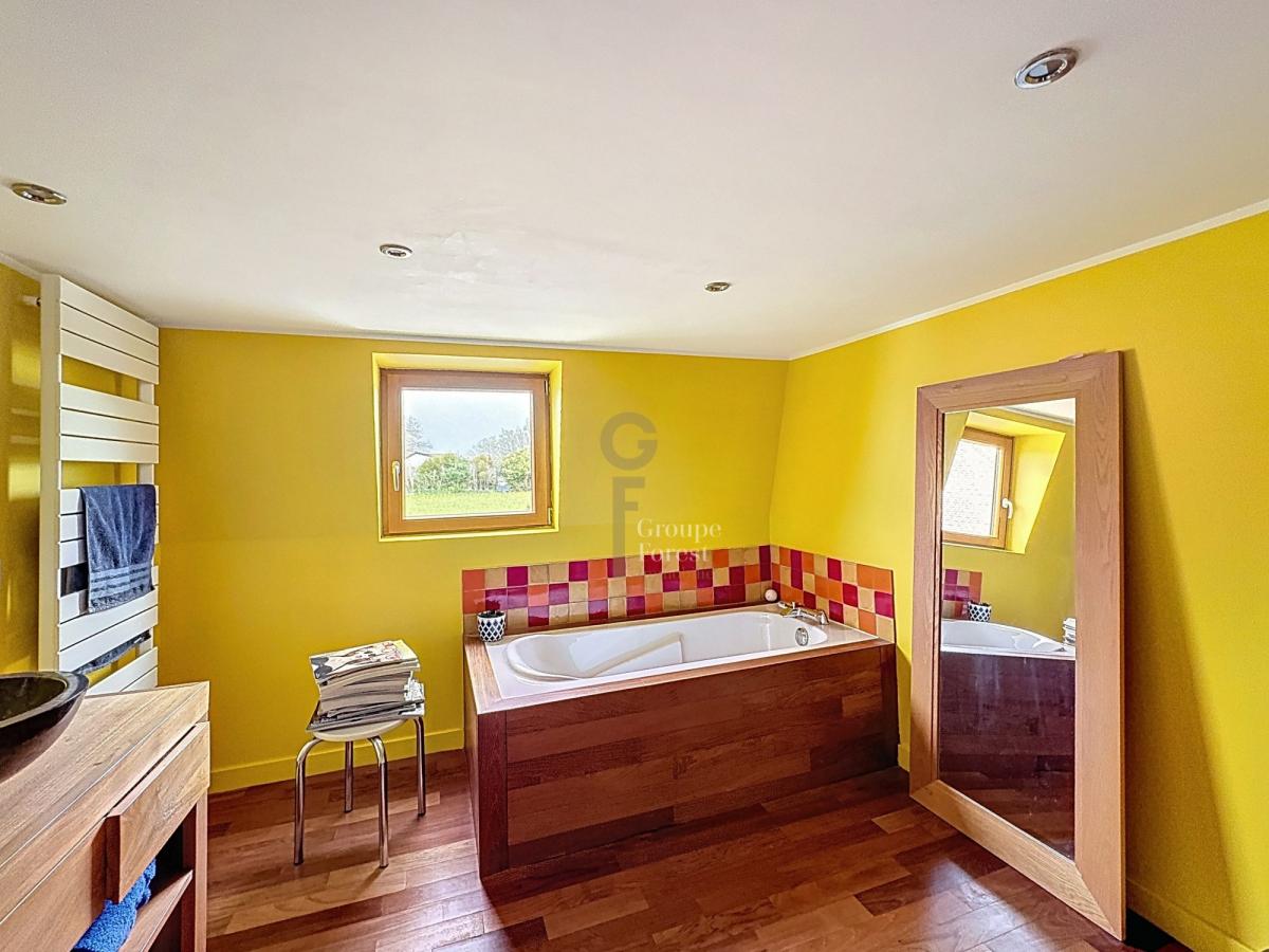 À l’étage, vous trouverez trois chambres (de 8 à 15 m²), dont une passante pouvant parfaitement faire office de bureau ou de dressing, ainsi qu’une spacieuse salle de bain avec baignoire et douche.