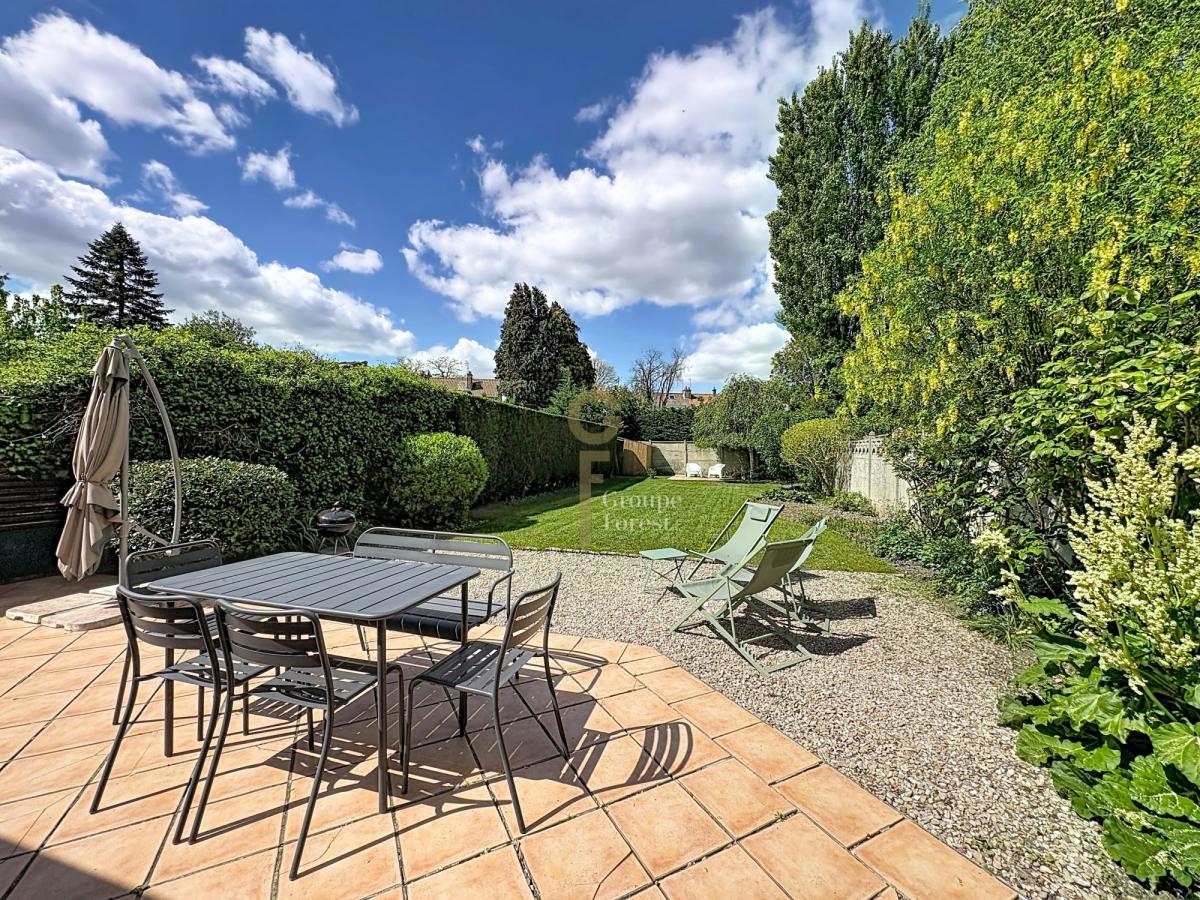 L’intérieur se compose d’un salon en deux espaces: un coin cosy autour de l’insert donne directement sur le jardin grâce à une large baie vitrée, et une salle à manger lumineuse de 28 m² sous véranda. Au centre, une cuisine ouverte fonctionnelle de 12 m². À l’étage, une grande salle de bain avec baignoire, douche et espace buanderie, ainsi que 3 chambres, dont deux communicantes côté jardin. Belle cage d’escalier avec vitraux d’origine et parquet. Possibilité d’une extension par le haut.